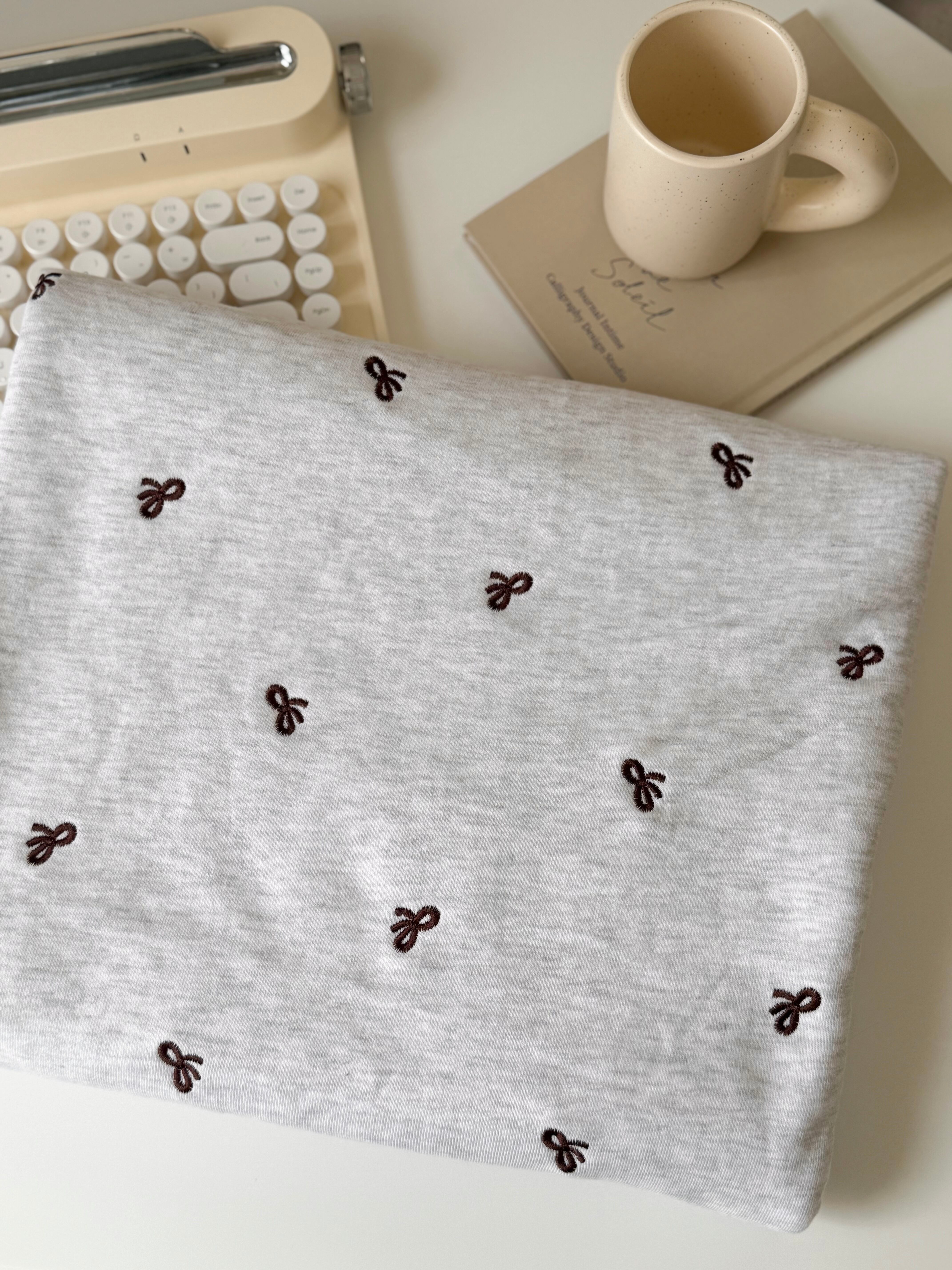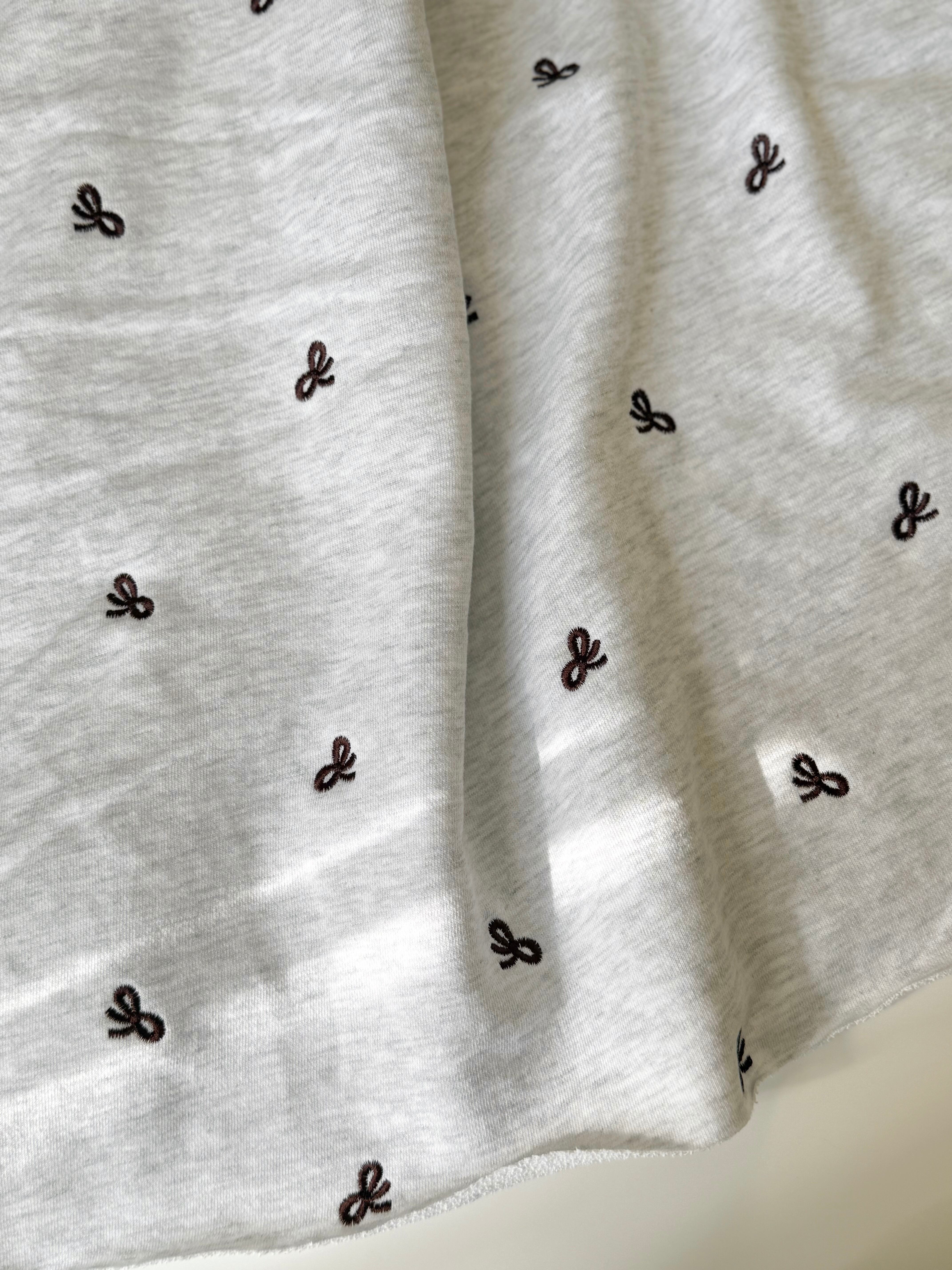 ダークブラウンカラーの大人かわいいリボン刺繍裏毛スウェット生地です。